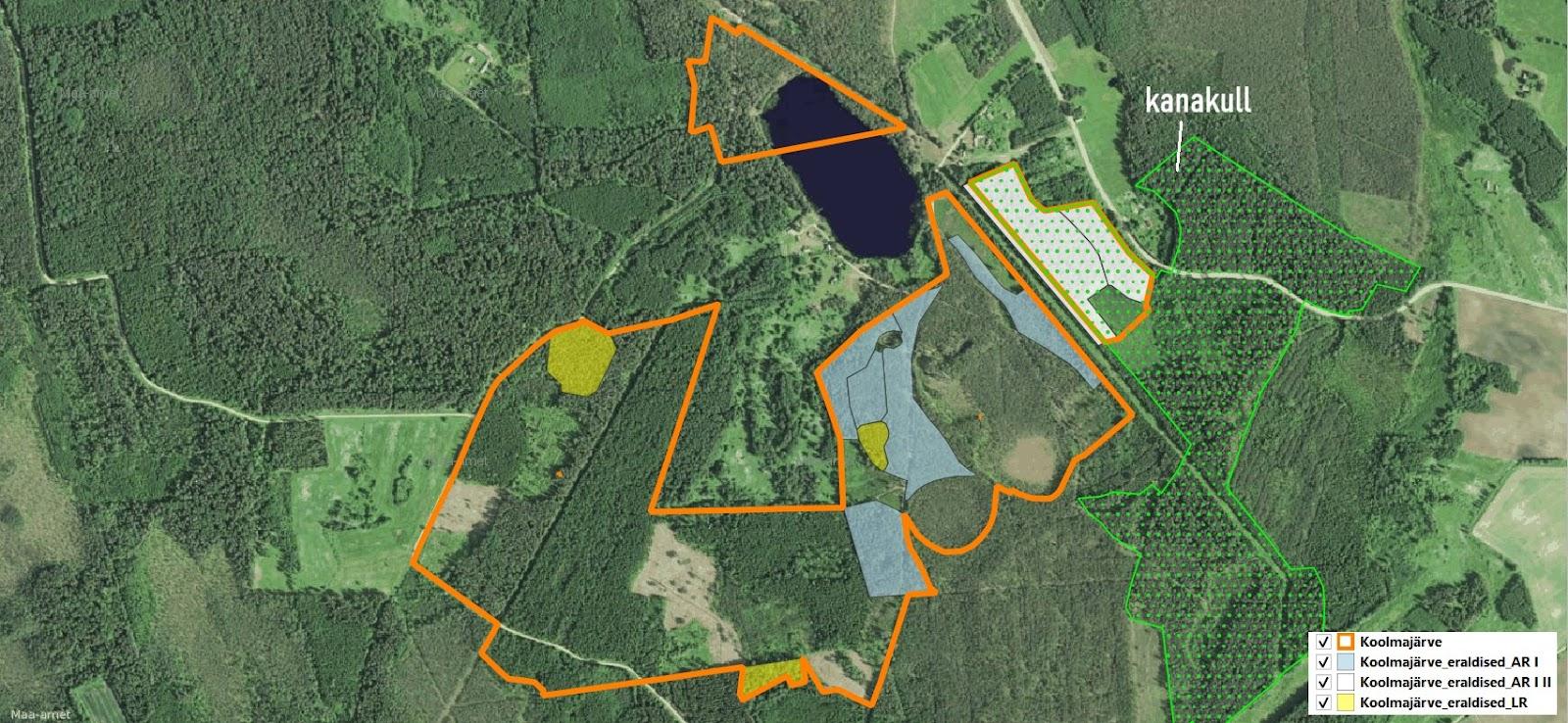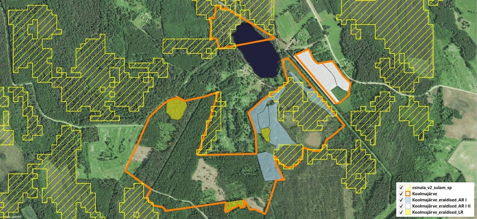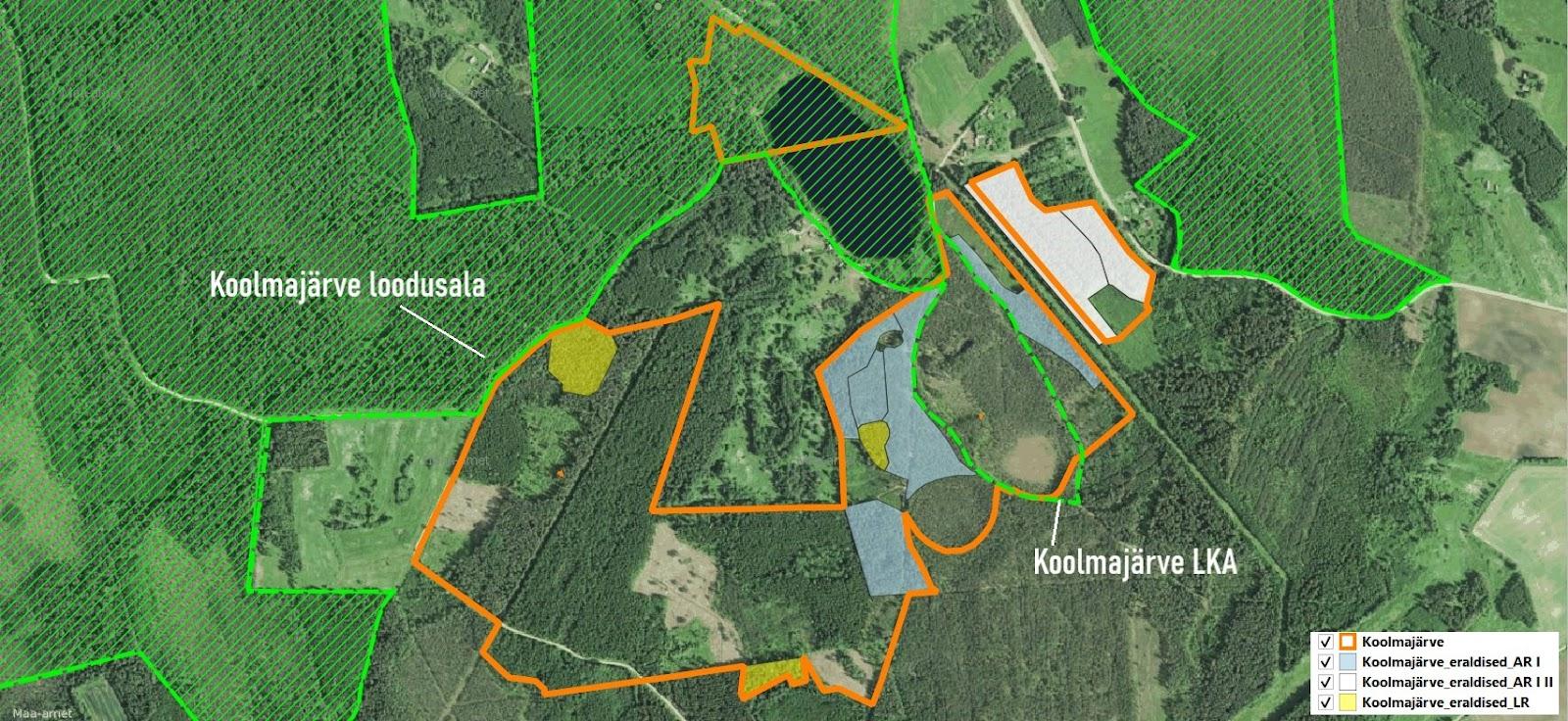 1. Kehtiva Räpina valla üldplaneeringu järgi on Koolma järve ümbrus rohevõrgustiku piirkond ning puhke- ja virgestusala maa-ala, kuhu RMK on teinud metsamajanduskava projektiga raie-ettepanekud, mis paiknevad Natura loodusala kõrval. Väljavõttel üldplaneeringu kaardist on tumeroheline ala ümber Koolma järve puhke- ja virgestusala maa-ala: http://www.rapina.ee/documents/378445/30240194/Maakasutusplaan_.pdf/c8f3ae72-c1ea-4aa4-9ee1-e22acac2b4d7?version=1.0